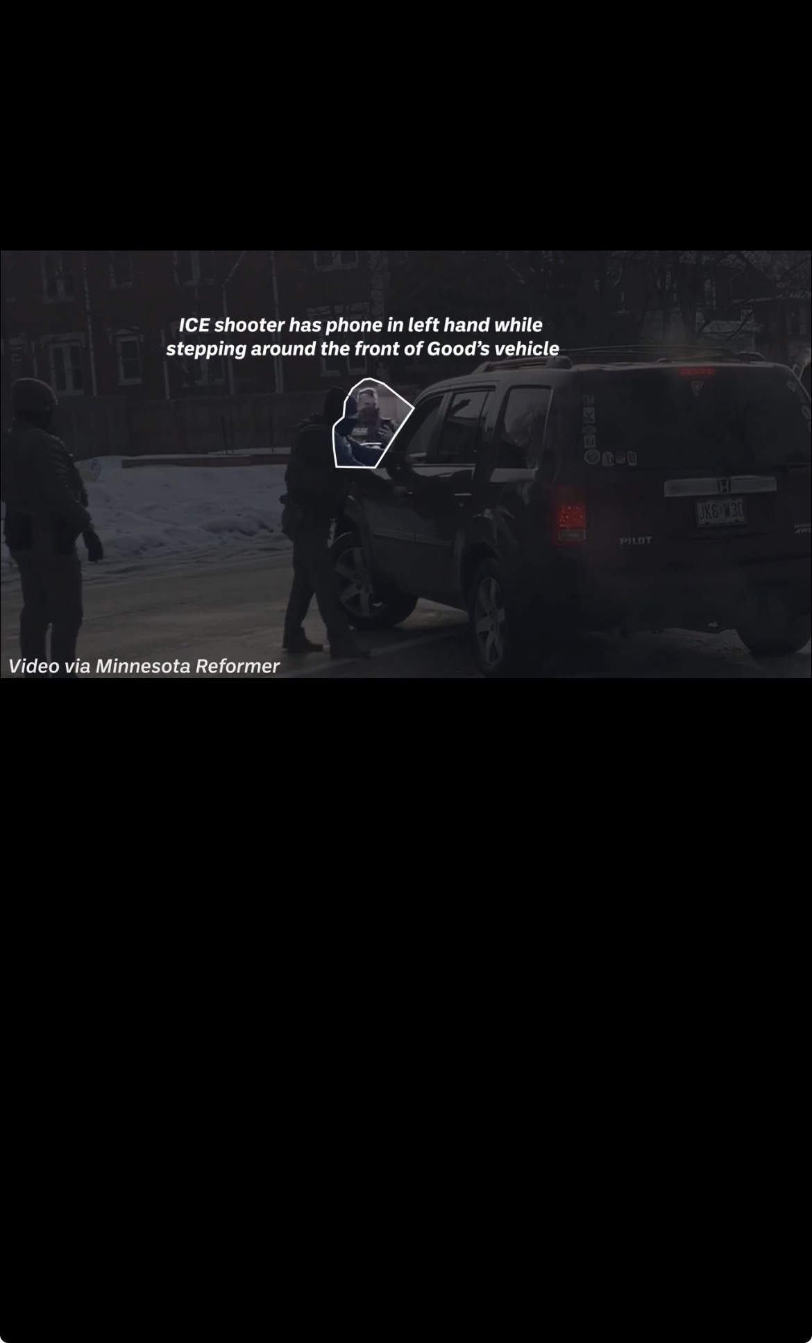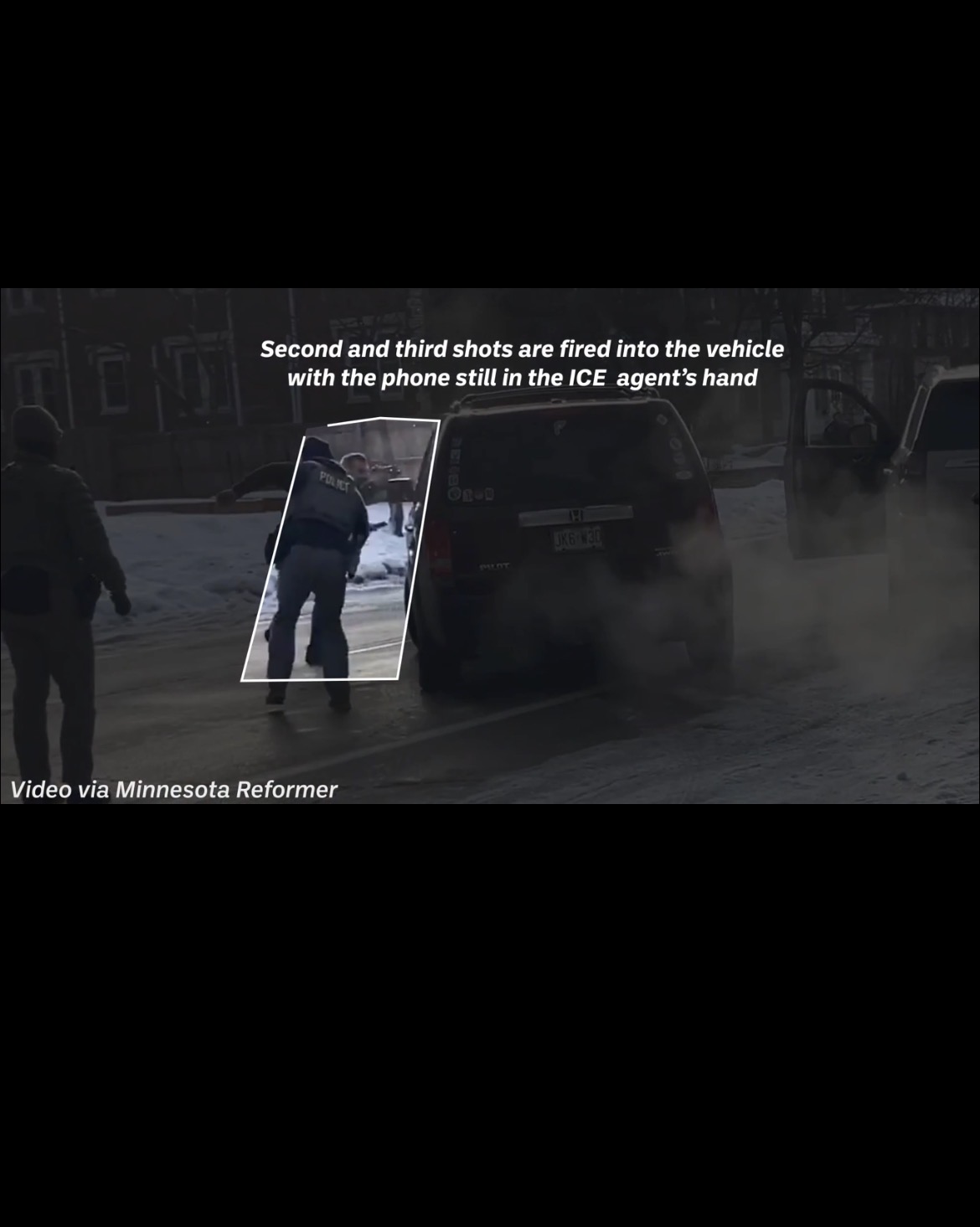 The administration says the ICE agent fired “defensive shots” because Renee Good was about to run him over. But a multi-angle video analysis argues the opposite: the SUV appears to reverse and then turn away, while the shooter is off to the side (left of the vehicle), not in its path, and he keeps firing as the car passes.