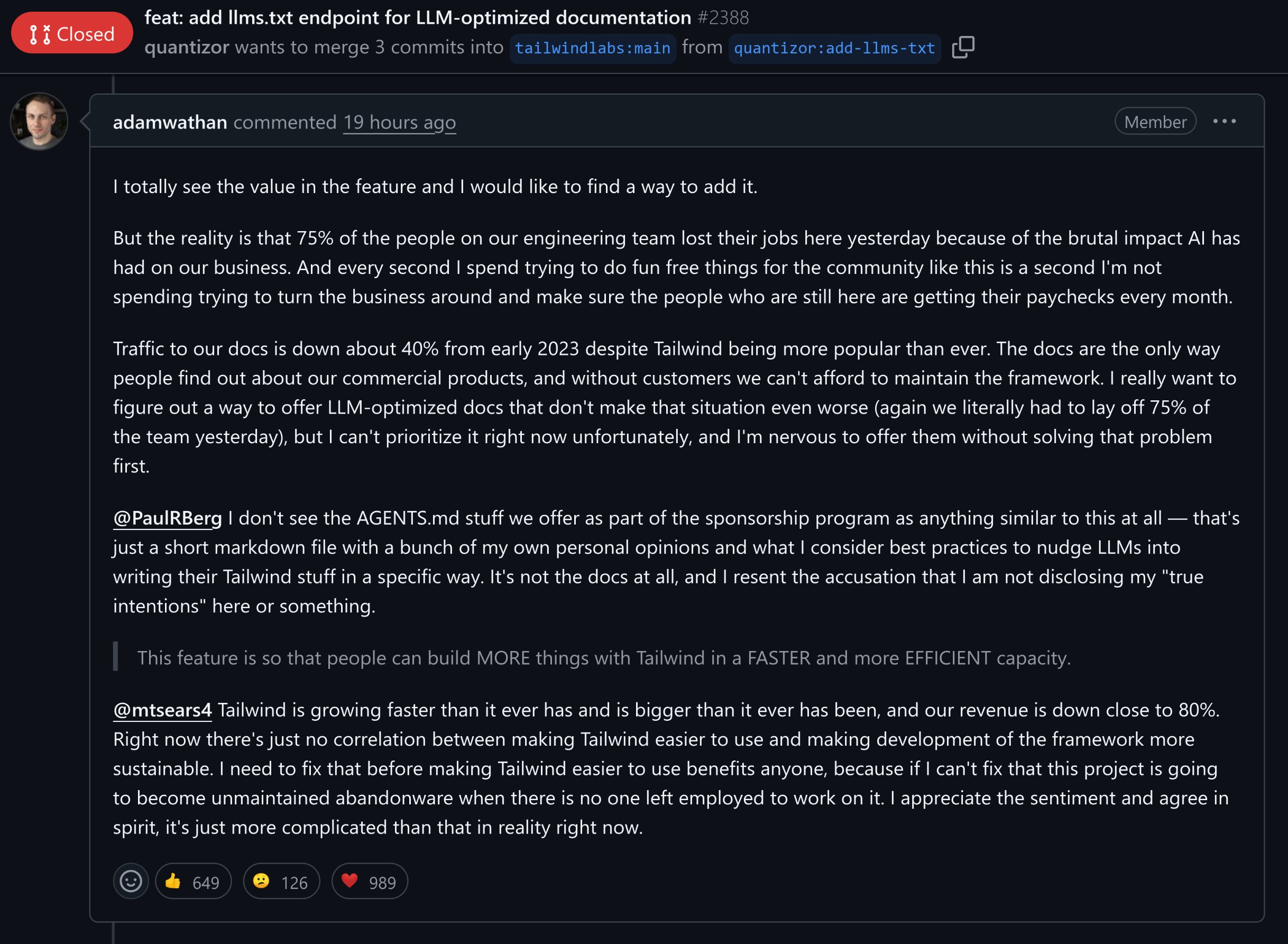 "Tailwind is growing faster than it ever has and is bigger than it ever has been, and our revenue is down close to 80%."