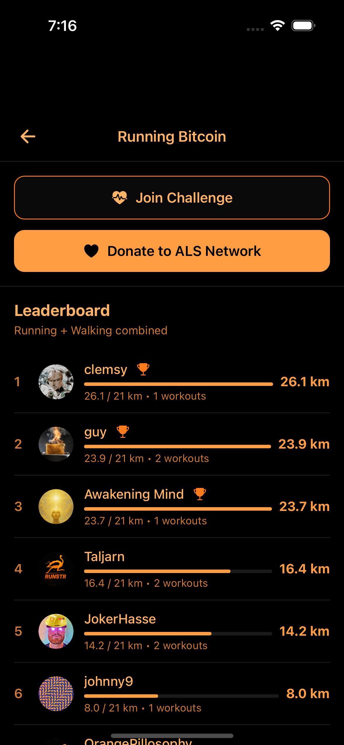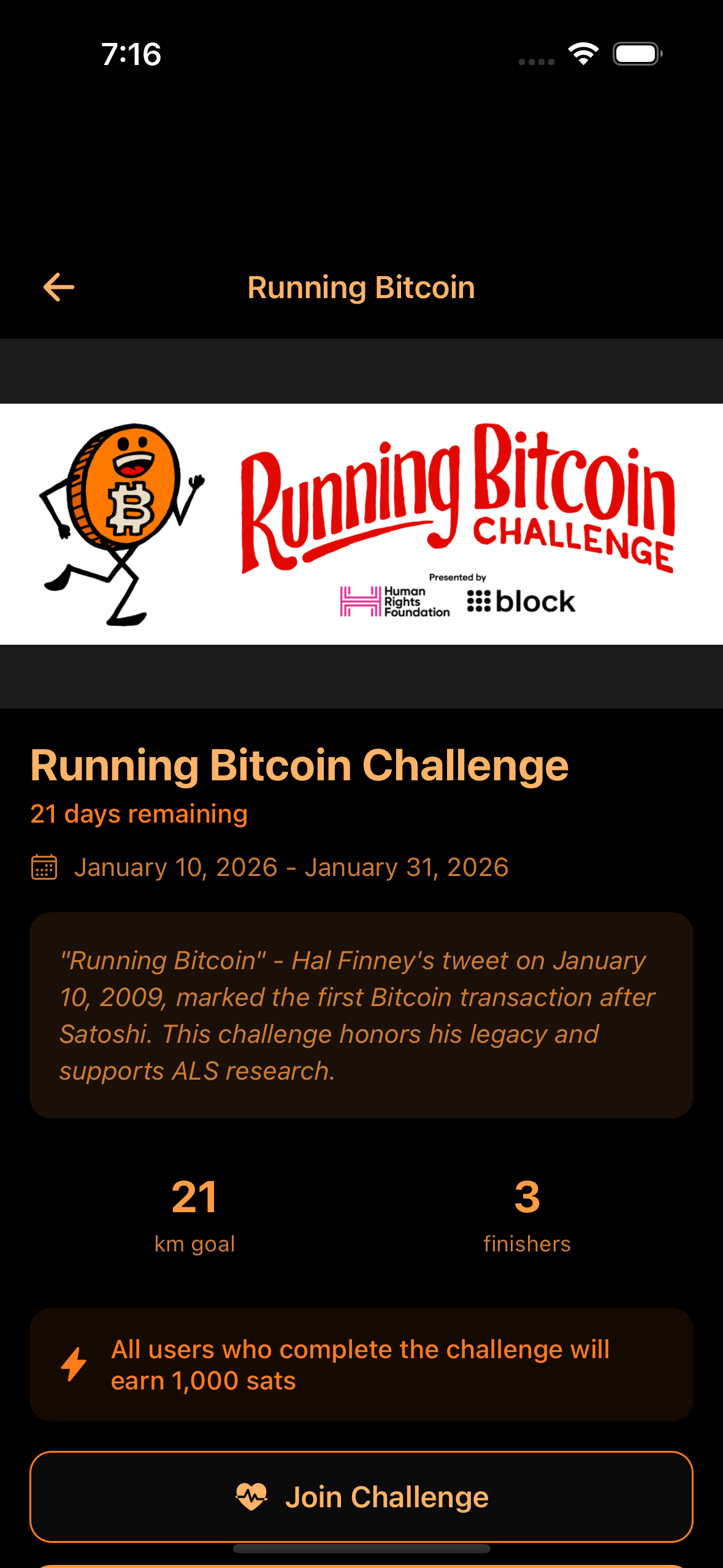 We've added full support for the Challenge within the app. Every finisher earns 1,000 sats. Donate to the ALS Network directly through the app.