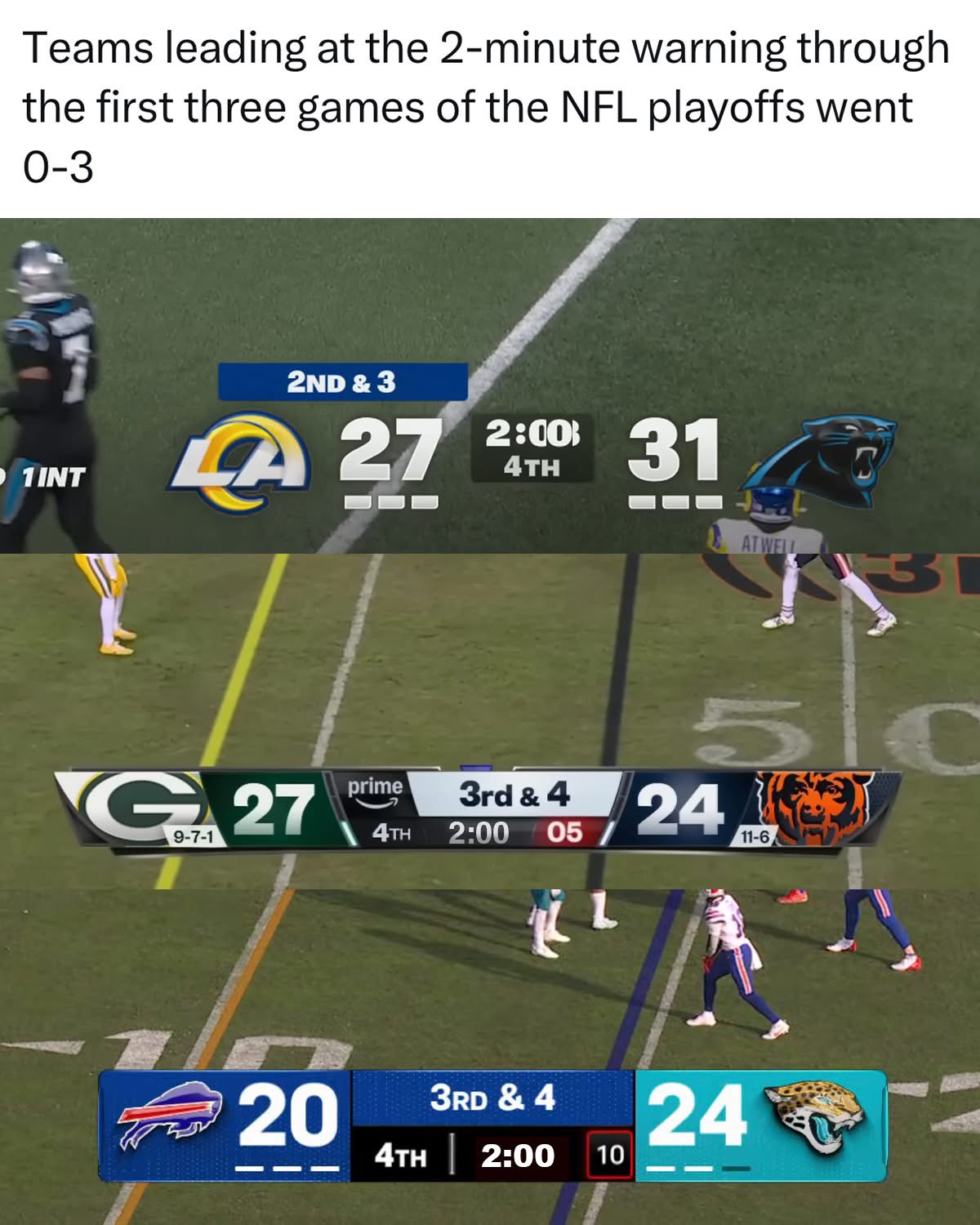Every team with the lead with 2min left in the NFL playoffs has choked