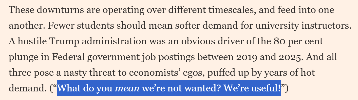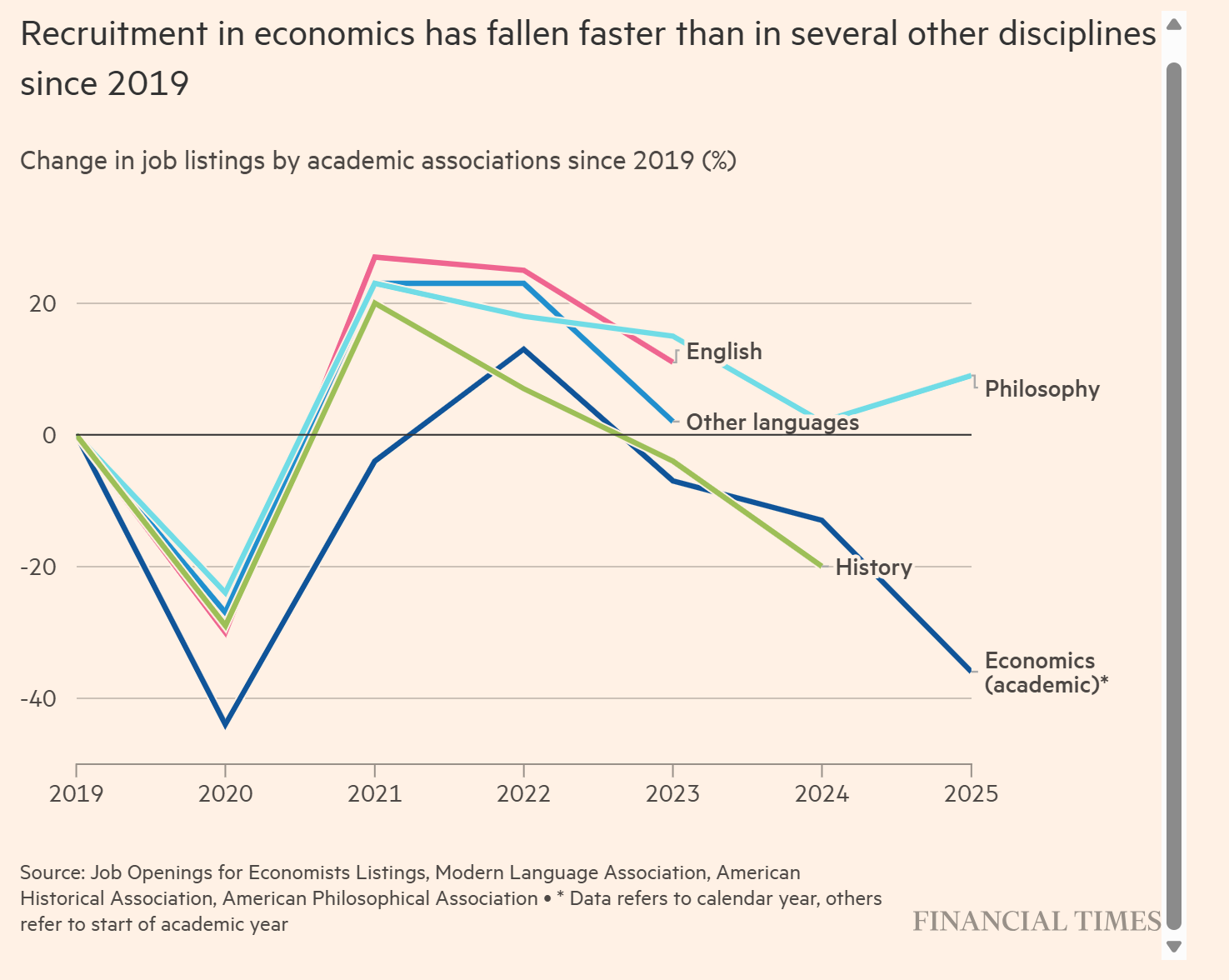 according to the most recent comparable data, since 2019 recruitment has shrivelled faster for economists than philosophers or linguists. Oof.
