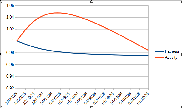 I made some initial gains in both activity level (red: higher is better) and fatness (blue: lower is better). My activity level took a dip this week, although I made more progress on fatness.