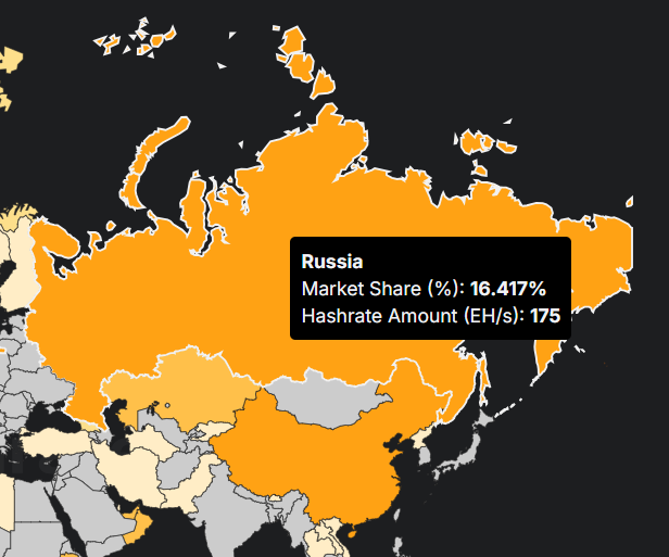 Russia does 16.417% (175 EH/s) of global hashrate: