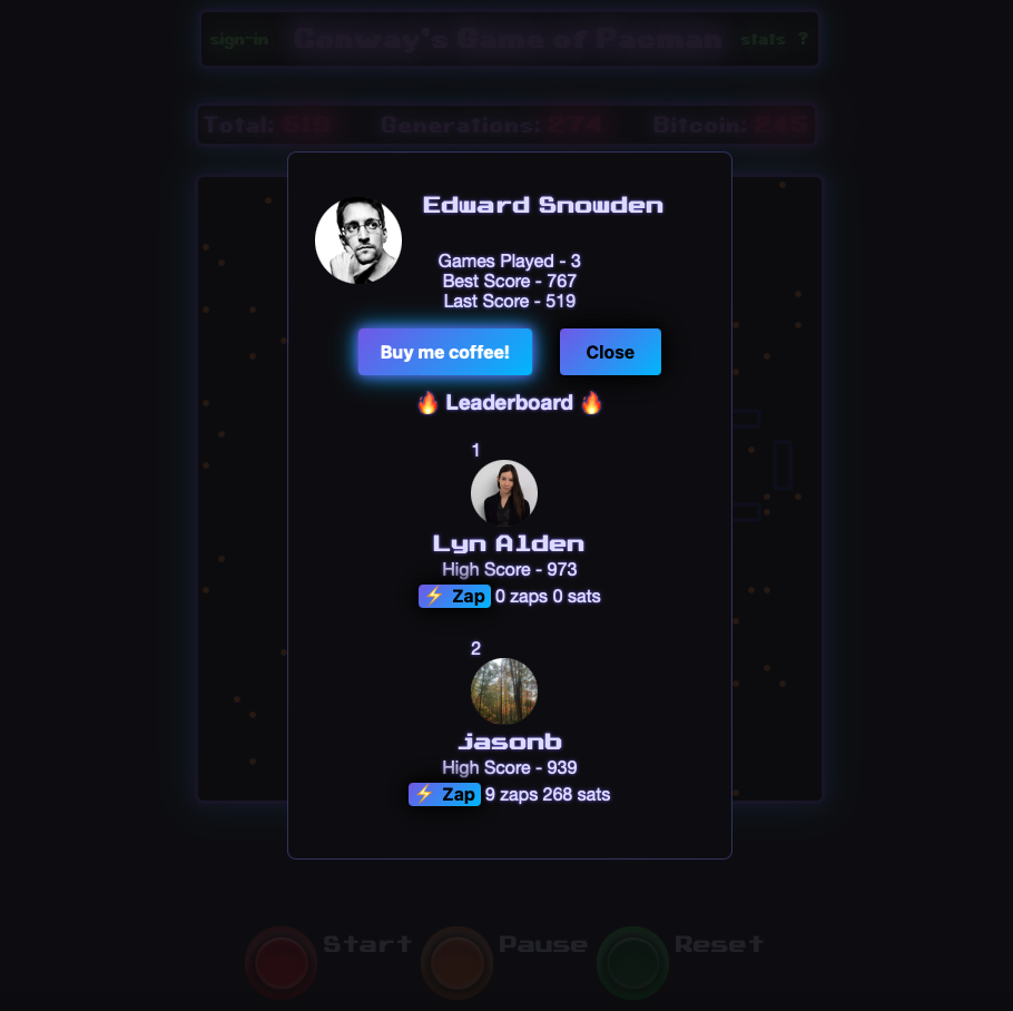 TLDR: This is a game that looks like pacman, but the walls move like Conway's Game of Life while you collect bitcoin. You can record your score using any nostr profile. You get one free game a day and then pay me sats. You can zap profiles on the leaderboard. It is way harder on mobile than on desktop.