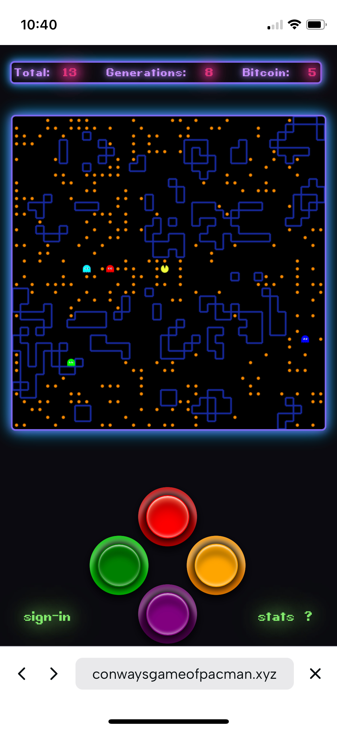 Also, instead of collecting glowing dots, you get bitcoin in this game. It's not real bitcoin, but it's called bitcoin in the game, so I think that's neat and maybe you will too. Each bitcoin is worth five points, in addition to the points you generate as each generation of Conway's Game of Life progresses.