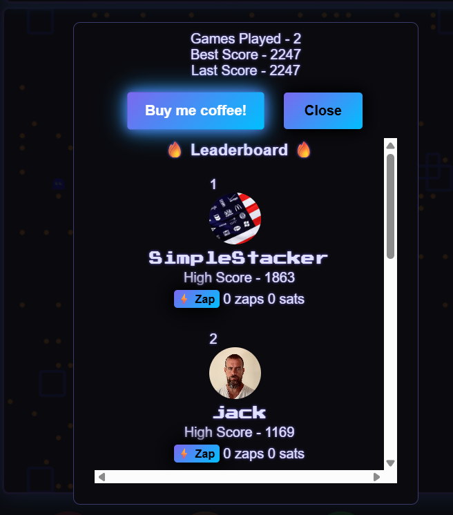 And I added real zaps. Currently, it only logs zaps that are done using WebLN (think Alby, Fedi, Zeus), but I may change this. Also, you technically only get one free game a day, but there are currently ways around this, which I won't share, but most folks on sn are way more technical than me to begin with. We'll see how people respond, but I'll probably leave these.