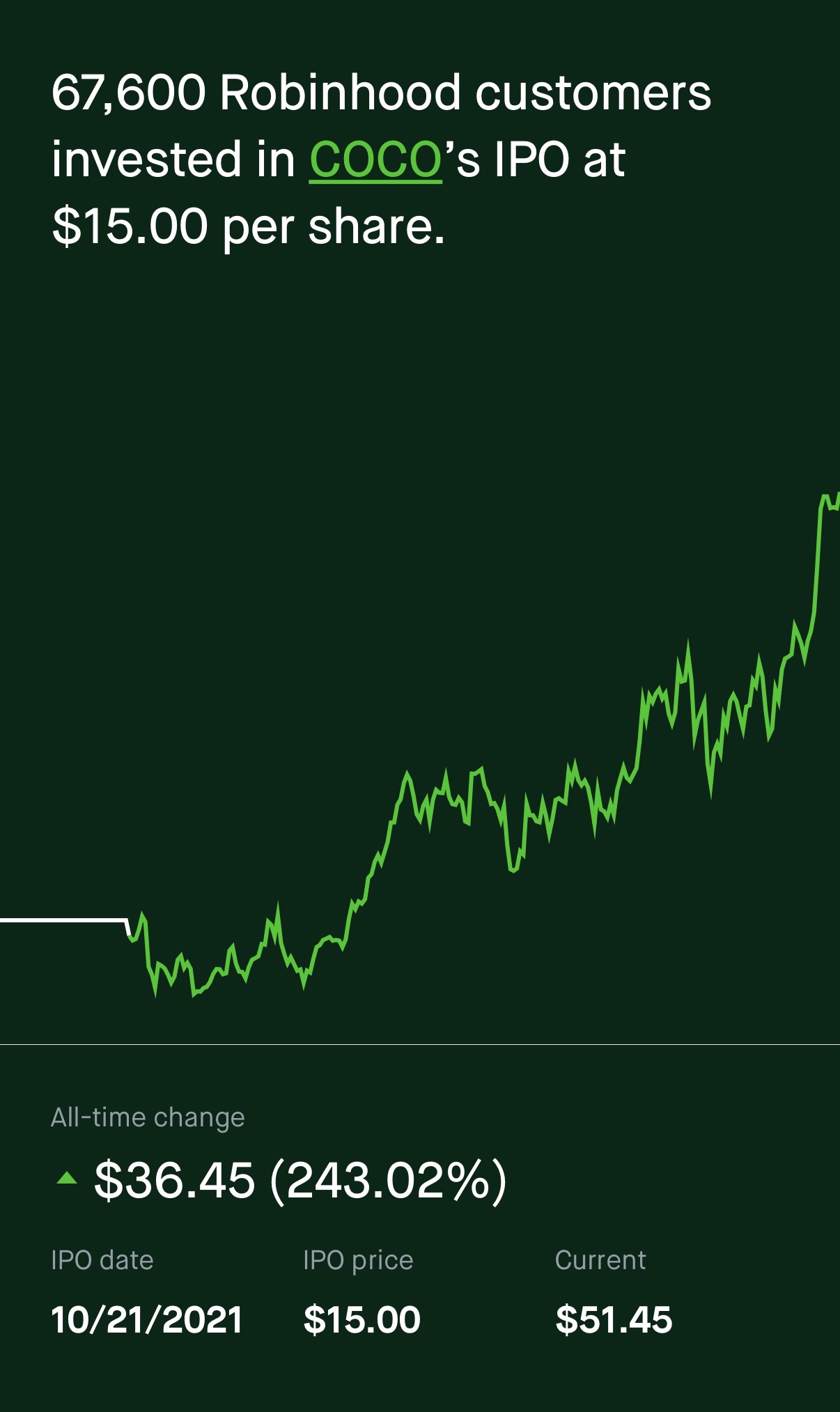 I always saw this coconut branded water in stores even bought a few cartons of it. I like the water it is very tasty but the high caloric content keeps me from drinking this all the time. Robinhood offered this stock via its IPO offerings. I didn’t get any shares but it is one of the few stocks that has done very well.