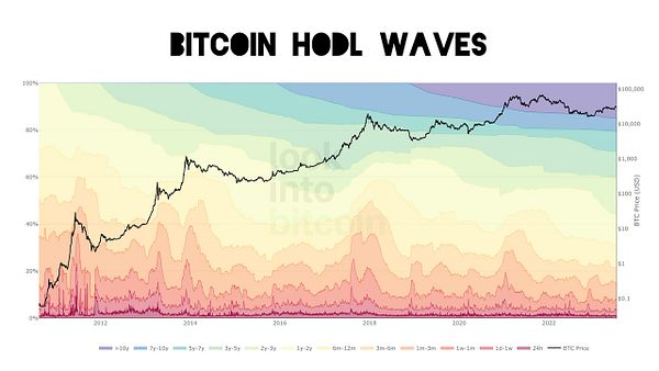 HODL Waves divides the total circulating supply of the Bitcoin network into holding period bands. The 1-to-2-year HODL wave, for example, measures the percentage of Bitcoin that transacted between one and two years. Short term age bands rise dramatically during periods of market exuberance and the 3y-5y band rises during major market downturns, signaling very healthy hodling behavior at the moment.