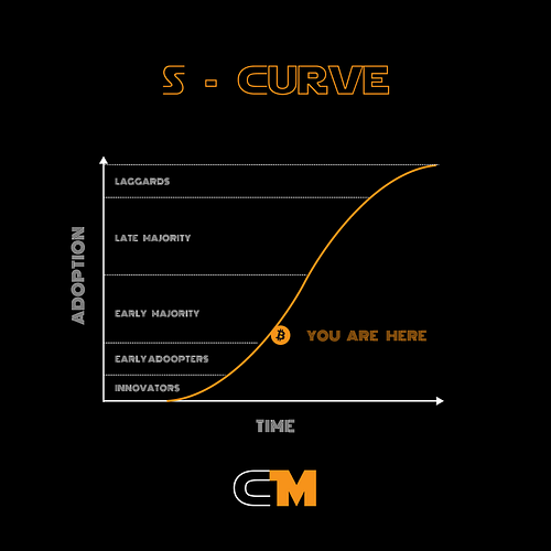 The S - Curve breaks global adoption into stages along the growth cycle. It is a term used to define a sociological framework that demonstrates how different people ranging in demographics and psychological characteristics adopt and react to new technologies and innovative products. In this concept, most of the growth occurs during the early and late majority stages. In other words: You are still early.