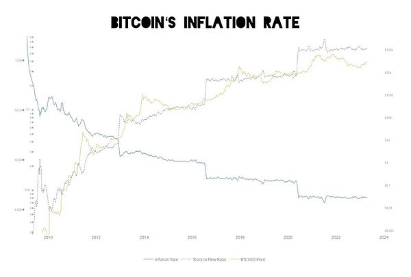 Furthermore, Bitcoin‘s inflation rate, the issuance of new coins to the circulating Bitcoin supply is also encoded. Unlike fiat currencies, which can be printed at will, the new Bitcoin supply is pre-determined and halves every 210,000 blocks (roughly 4 years). Currently, Bitcoin has an inflation rate of 1.74%, comparable to that of Gold. The next halving occurs in April 2024, making Bitcoin much scarcer than most other assets.
