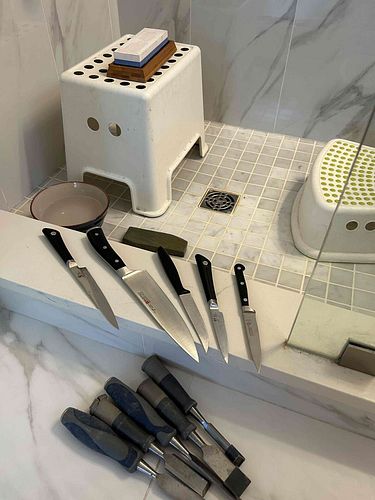 After learning to sharpen my chisels, I've also moved onto sharpening kitchen knives for my wife. I love hearing the sound of the stainless steel blade grind along the whetstone. Hearing the rhythmic sounds while moving my arm and hands back and forth along the whetstone clears my mind and relaxes me. As a result of my hobby / obsession, my wife's kitchen knives hardly ever get dull.