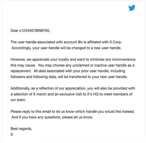 Considering how insanely valuable these domains are you'd think the @ x Twitter handle should be worth more than some merch and a meeting with Elon.
