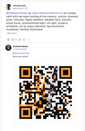 Here is an example of using the qr command:qr https://decouvebitcoin.fr/ an orange rabit with red eyes looking at the camera, cynical, dramatic pose, intricate, highly detailed, detailed face, smooth, sharp focus, environmental light, rim light, artgerm, artstation, art by greg rutkowski, ilya kuvshinov, rossdraws, fantasy illustration