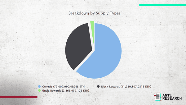 The image below demonstrates how the distribution of ethers is now, notice how the tokens that were pre-mined at the beginning of the network are still the majority. Only the PoW and PoS component correspond to ETHs that were created from chain work or validation.