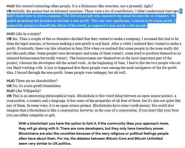 Unlike Satoshi, who never made a profit, Vitalik, through the Ethereum Foundation, sold ethers on the minds of retailers, that is, people. This is quite unethical, especially since on the Ethereum Foundation's own website they call themselves a non-profit organization. It gets worse if we remember that it is a protocol that created its own tokens from scratch and that insiders have a considerable volume to sell if they want.