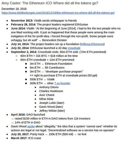 In the article below, now removed from the air, by The Block it is clear the sequence of events and how ethereum insiders disproportionately benefited from its creation.