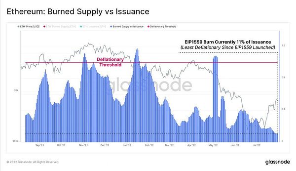 In the image below, it is possible to observe that in 2022, with the market slowing down and the recent price drops, ethereum rates reached their lowest levels, back to the levels of May 2020. As a result: only 11% of the issuance was burned. This means that ethereum is inflating, it is creating more ethers than it burns.