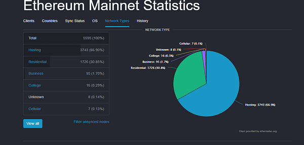 Another issue is also the centralization in the Ethereum network architecture. The nodes that verify and validate the blocks have their machines totally dependent on datacenters or centralized companies.