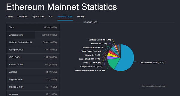 Of these cloud servers, about 58% of the nodes are in Amazon datacenters and 14% in Hetzner, not counting the other datacenters in smaller proportions that appear there. This means that if a government orders Amazon to shut down Ethereum nodes or censor any specific user, they will have to comply.