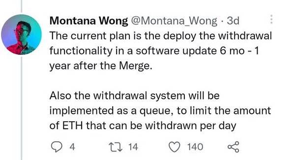 It's like the california hotel, once you get in, weird things happen and you can't get out. This is because many people who left ETH staking a year or more ago and, after the Merge, may want to withdraw their ETH, but they will not be able to withdraw when they want because there will be this “queue” of withdrawals and there is no transparency about who will have priority or not. There is also no timetable for what staking rewards will look like over the next decade or century. Everything is in the hands of Vitalik and his foundation, there is no public and transparent predictability.