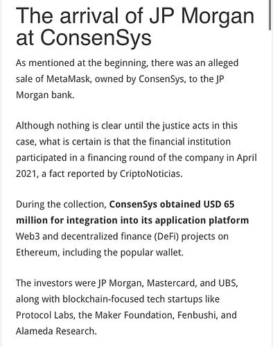 Huge centralization also appears in other parts of the ethereum ecosystem. Metamask wallet linked Infura, a company that manages remote ethereum nodes, has censored users from Venezuela. Besides, Metamask was also bought by JP Morgan and other banks: