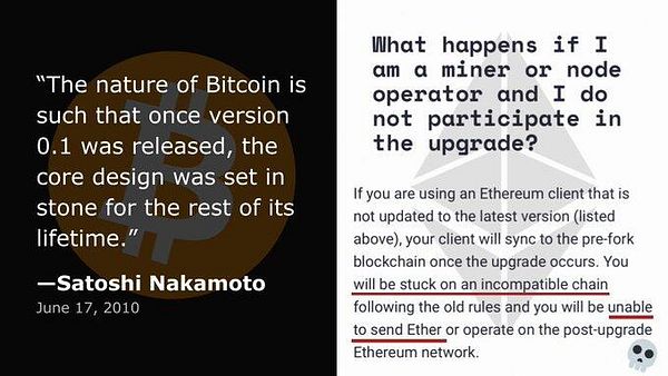 These changes in the code, in the consensus mechanism from PoW to PoS also show how Etheruem is not immutable. A key feature for any protocol to be considered secure and decentralized. Even the change to PoS even has a “date” and a block height. Vitalik himself posted this from his twitter.
