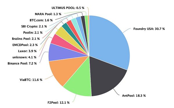 Today we're watching hashpower majorities being formed at the grid via industrial connections and energy contracting. Many big miners are publicly listed companies that anyone can buy ownership into. The newest ASIC's have large purchase agreements. Professional pools require hashpower minimums. Sure, plebs today can afford an ASIC or two, but mining hardware increases proportionally with bitcoin's price, adjusted for hashpower, minus theta as the next halving persistently approaches. Mining is slowly leaving the pleb world behind and industrializing. Braiins Pool (formerly Slushpool) is a pleb favorite and you can see the struggle there to keep up with the Foundry's of the world. What is amazing though, is that over time mining has consistently distributed and gotten more decentralized. Anyone remember back in the day when there were only 7 mining pools and GHash.io had 48% of hashpower? Or when nearly 80% of bitcoin mining was China-based? Today mining pool hashpower distribution looks as follows: