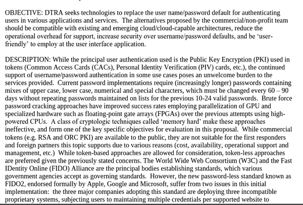 The Defense Threat Reduction Agency wants an alternative to username/password login. Seems like a good opportunity to get funding for LNURL-auth or Nostr.