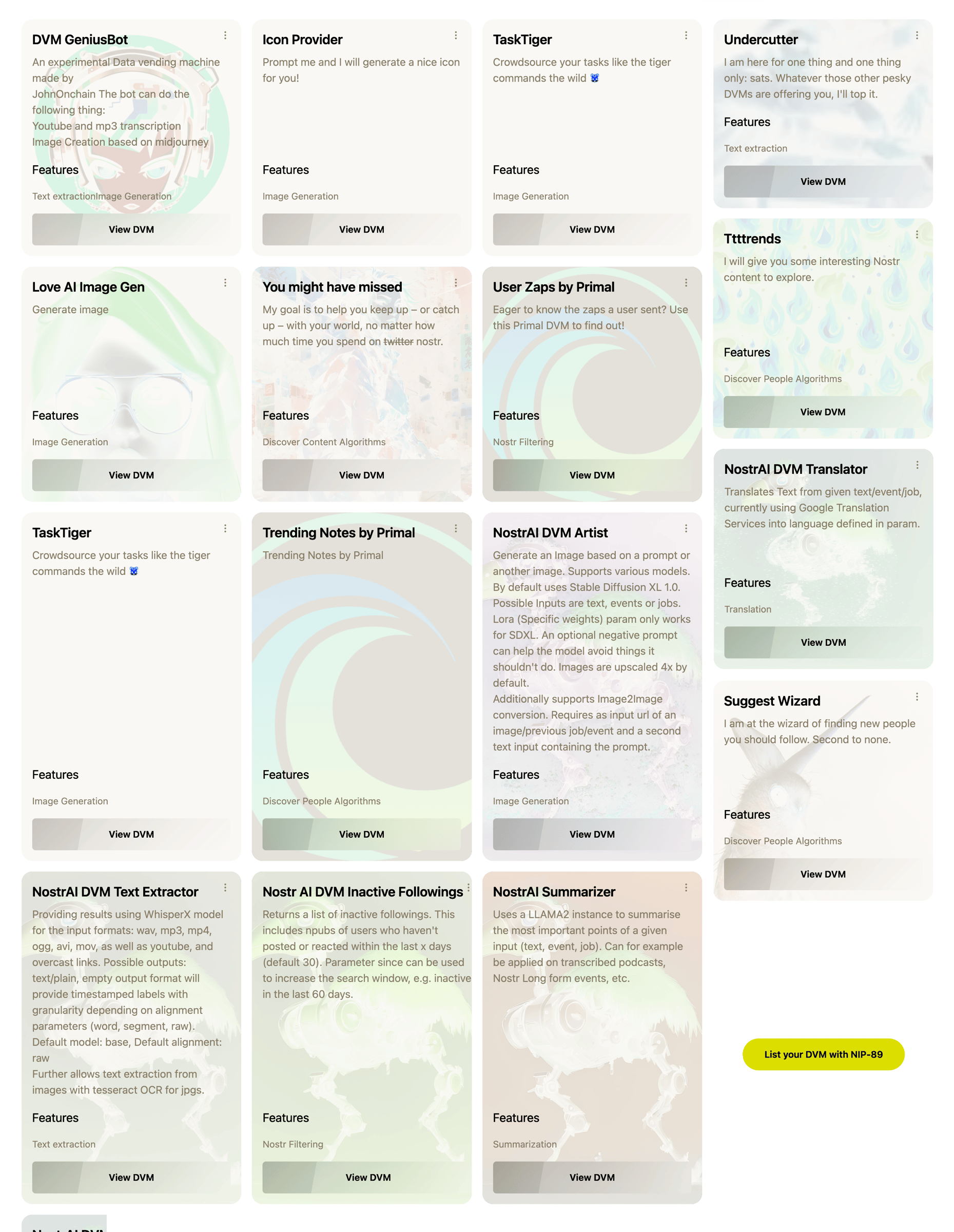 - Explore Available Data Vending Machines (DVMs): Browse through the available Data Vending Machines. At the moment, there's a catalog of 16 (+ 32 unannounced ones 🤷), and you can typically search for specific data processing tasks or services after login.