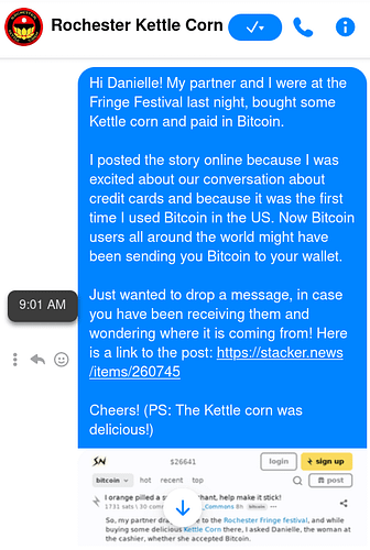 PS: This is their facebook page. If this takes off, I plan to leave them a message tomorrow so they know where all the sats are coming from. I am also including a screenshot of our purchase payment, as well as a photo of the kettle corn we bought!