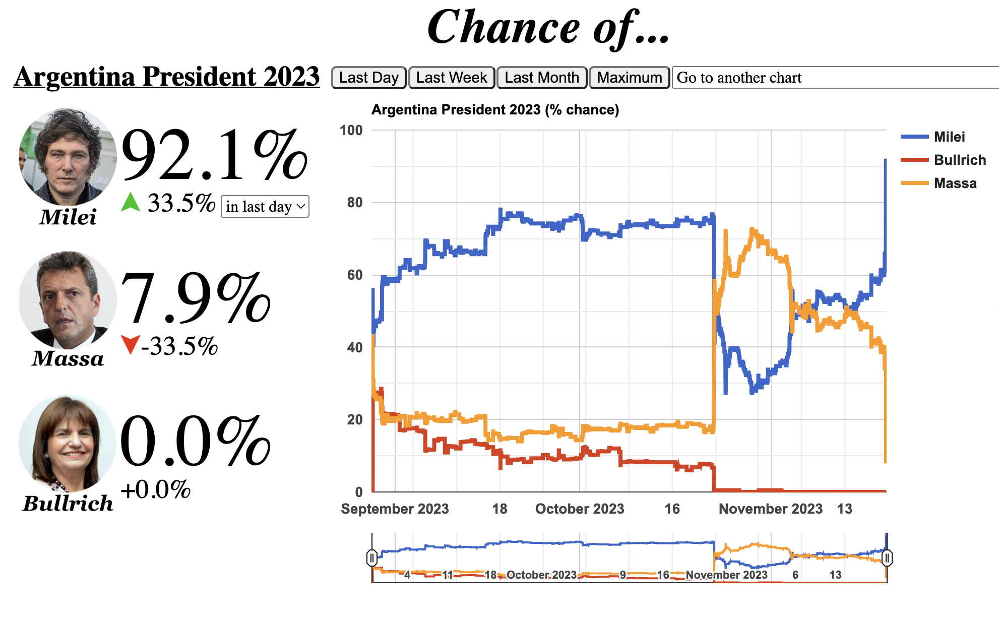 For anyone watching this thread, odds briefly jumped over 90% for Milei based on initial results starting to trickle in showing a strong lead. VAMOS!