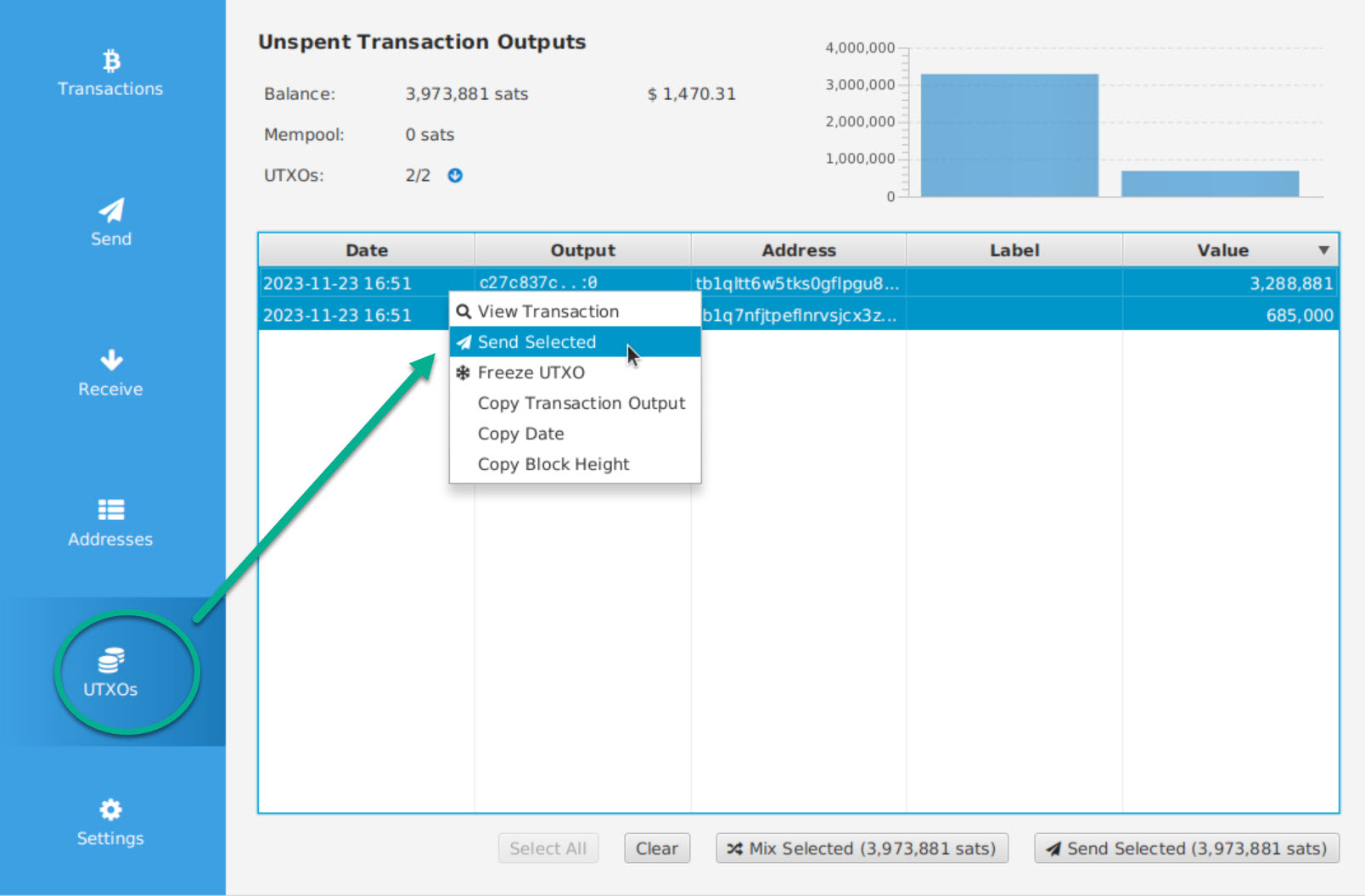 Open the wallet you want to “protect” by the dead man’s switch and navigate to UTXOs. There you can see all your available outputs to spend. Now select all the utxos you want to include in your dead man’s switch, mark them, right click them, and select “send selected”.