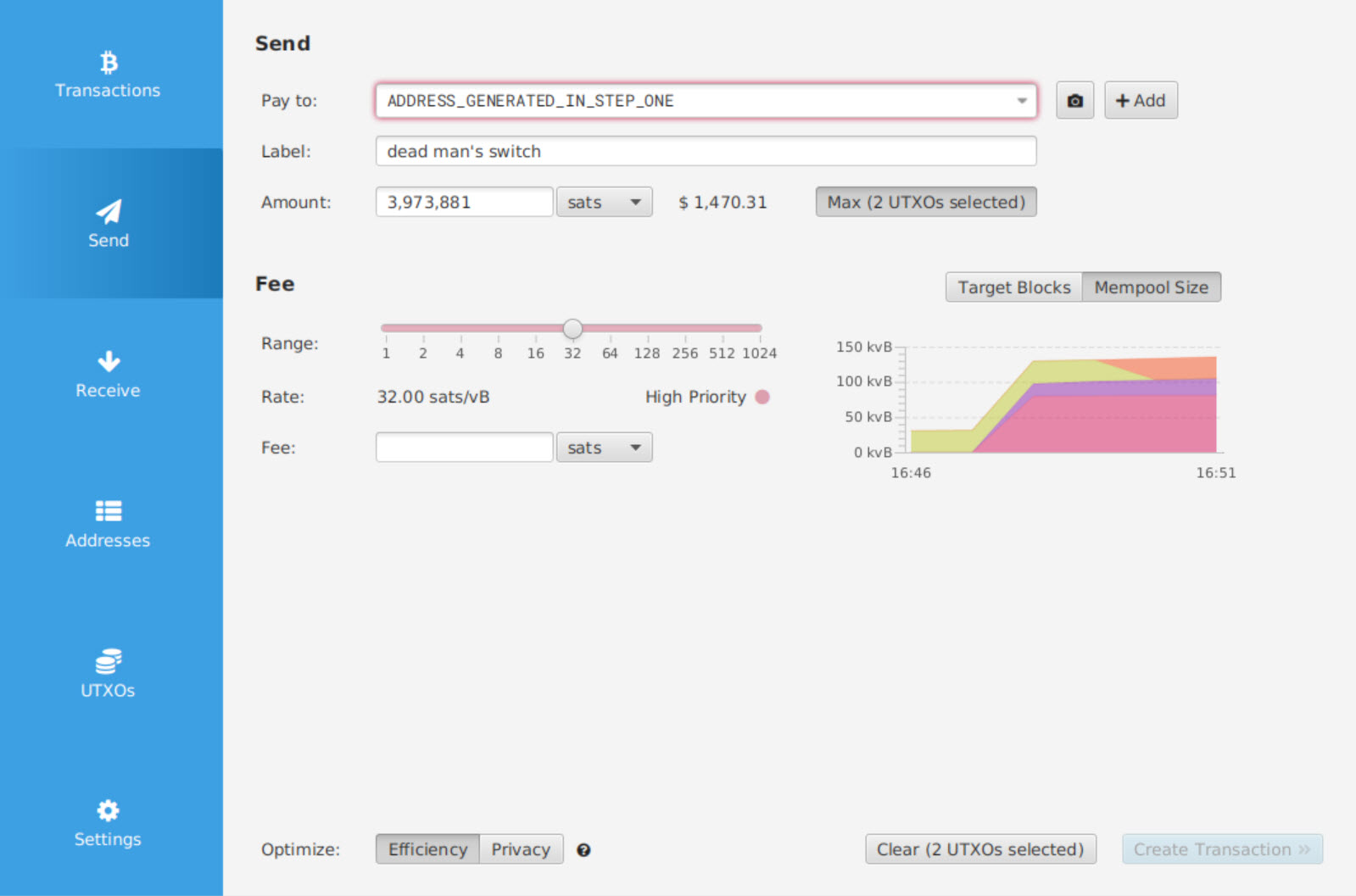 Next paste the generated receiver address which you generated in step one. Use a fee that is not too low. Of course, you don’t know how the fees will be in the feature but if necessary, you can always do a CPFP. Click “Create Transaction”.