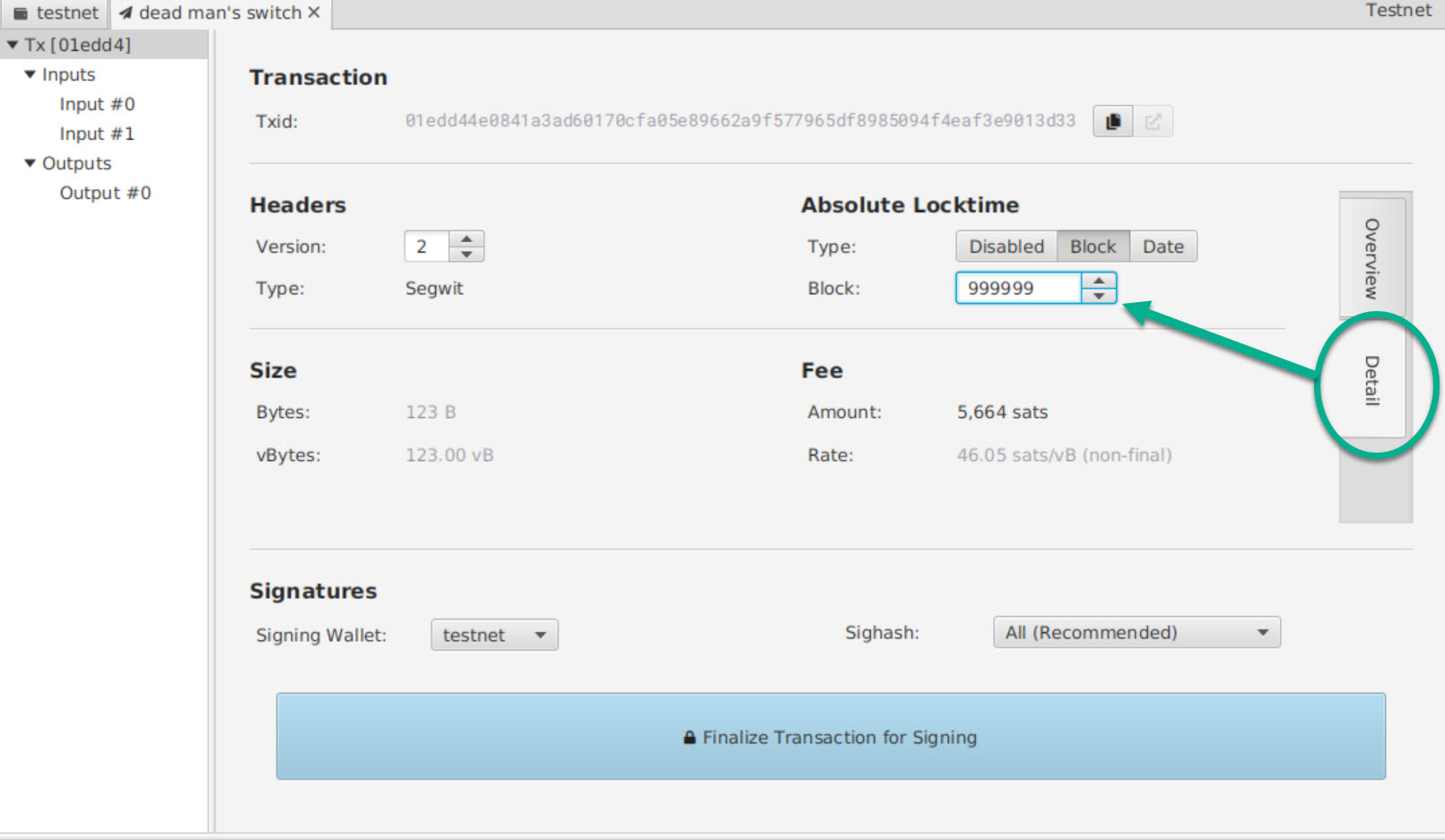 This is the important part of the transaction. You must lock the transaction to make sure it is only valid in the future. Click on “Detail” in the transaction screen and choose the appropriate locktime. You can either select a block after which you transaction will be valid or a specific date.