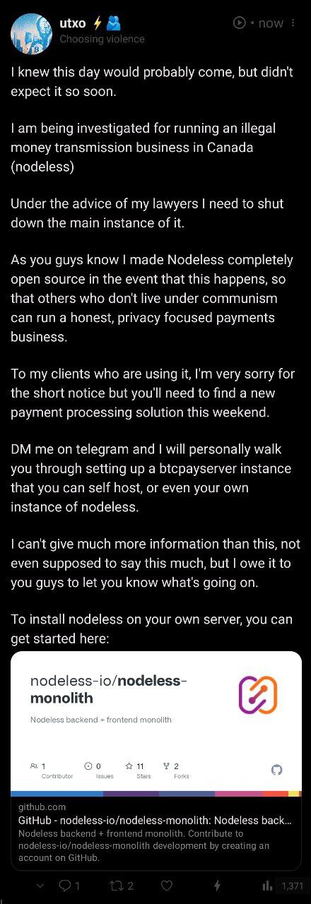 Here it comes. Running a node and being called a money transmitter. (He was doing this for others as well) using his software and didn't custody any funds. He even said this day would come....