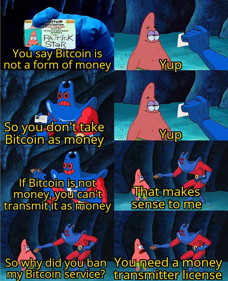 I got into this with the lead council of a very big financial firm who was advising me, as I take the position that Bitcoin is speech and fiat rules can GFY.