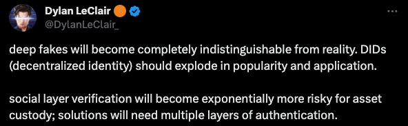 basically just trying to say that more people will learn the fruits of decentralization and hard money because of AI taking advantage of the weaknesses in fiat. Data honeypot leaks will get much worse, more money will get stolen, more reason to try and enforce KYC, etc etc. AI makes the problem loud and clear. Our security measures are weak. The internet isn’t safe store of information. Custodians are vulnerable. But those are the problems we live in today, not the future.