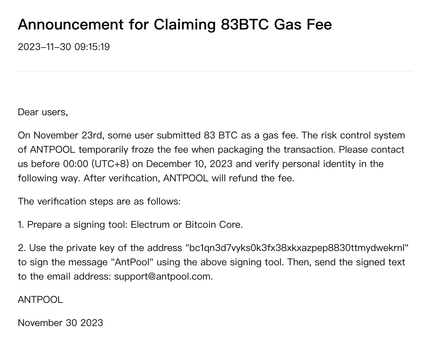 It appears that ANTPOOL has frozen an 83 BTC fee and is requesting users to verify their identity by signing a message using the private key of a specified address and sending it to support@antpool.com before December 10, 2023, to facilitate a refund.