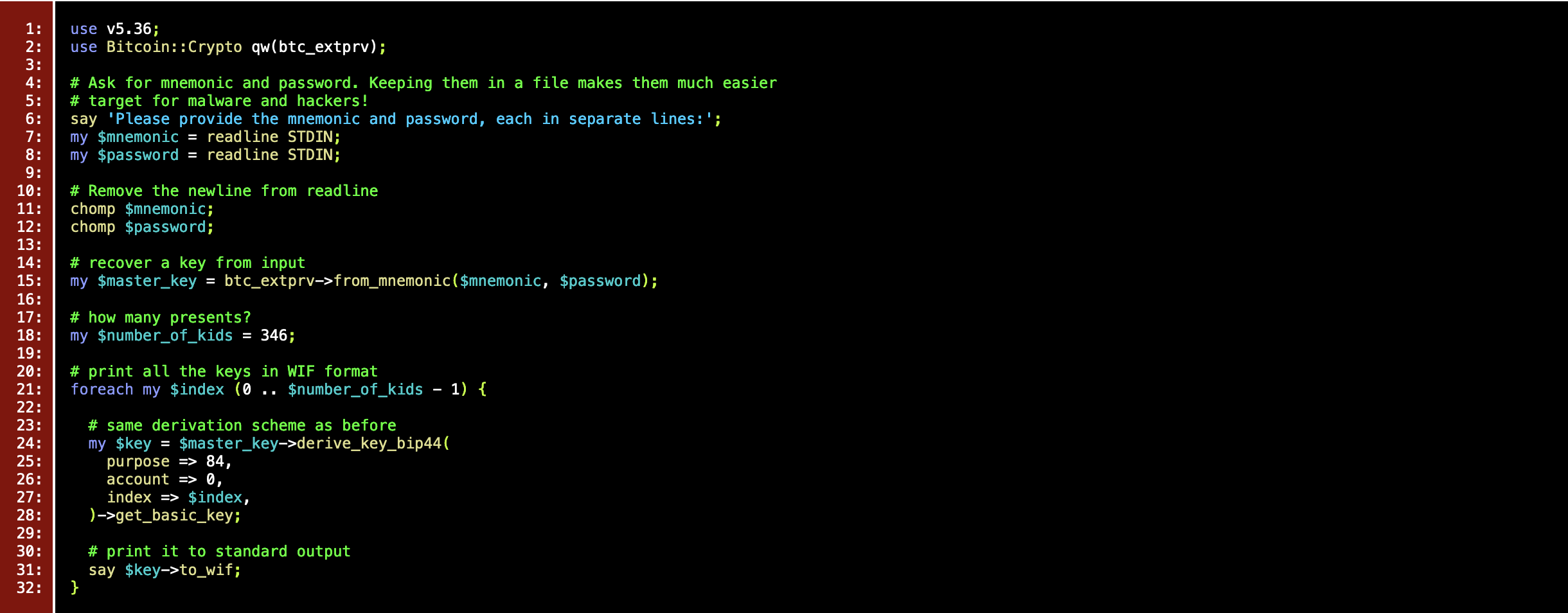 He quickly came up with a plan: the private keys will probably be printed on lovely decorated Christmas gift cards. All he had to do is provide printable representations of the private keys and the other elves can do all the printing. McJingles decided it will for now be enough to print all the keys as those Wallet Import Format (WIF) things he had used before to get access to the initial 50 BTC. The standard output of the script can be redirected to a file with no additional effort.