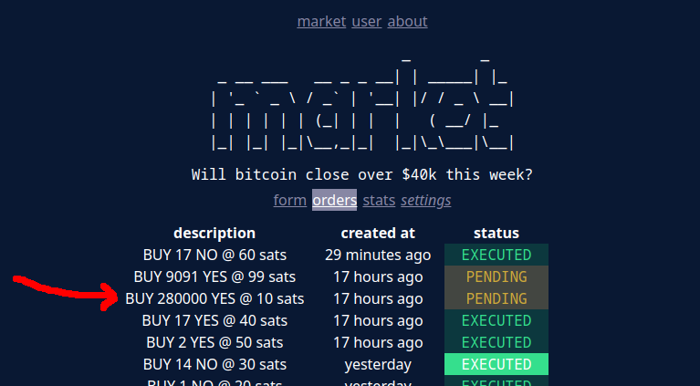 I had to lol so hard at this guy since I think they figured out that I am going to match any order just to provide liquidity. So they are actually very sure that bitcoin is going to close above $40k this week so they decided to get maximum profits by actually pretending they are very unsure so they only have to pay 10 sats per share, lol
