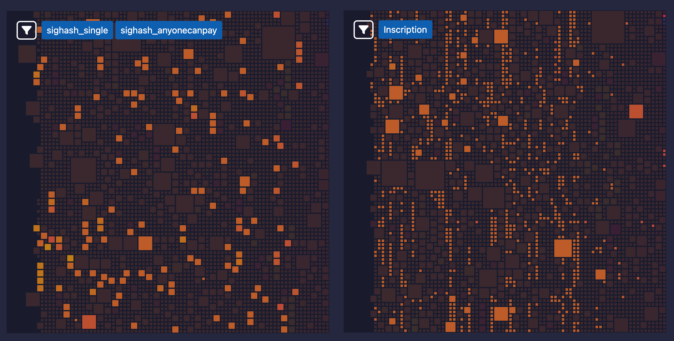 (the template on the right shows the projected next block, with inscription transactions highlighted. In the template on the left, transactions using both "sighash_single" and "sighash_anyonecanpay" signature flags are highlighted, which is a good proxy for PSBT trades)