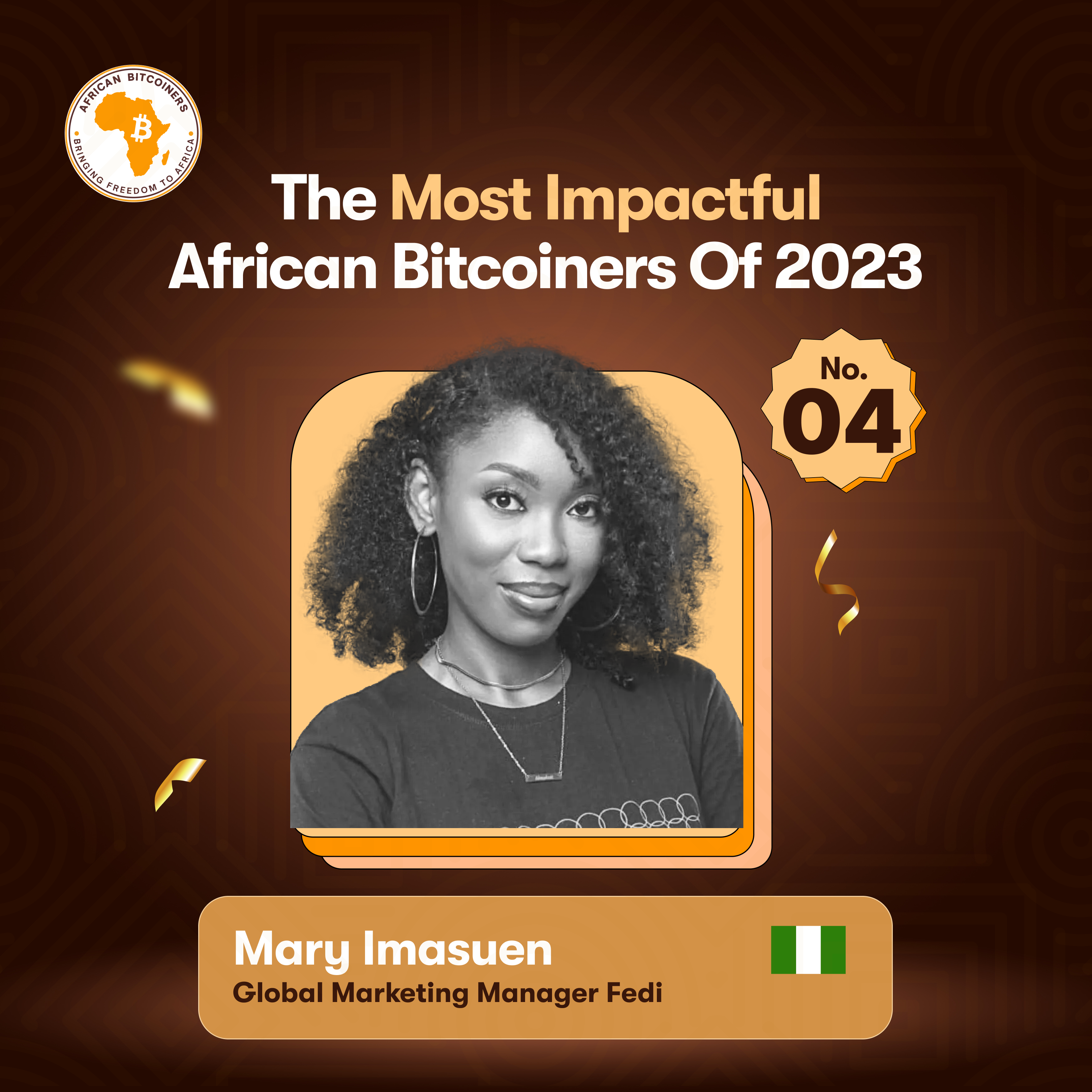 Our fourth most impactful African Bitcoiner is Mary Imasuen. Mary is a passionate advocate for Bitcoin in Africa. She is the Global Marketing Manager at Fedi. Cheers to Mary for her efforts towards spreading Bitcoin throughout the continent! https://bit.ly/miab23