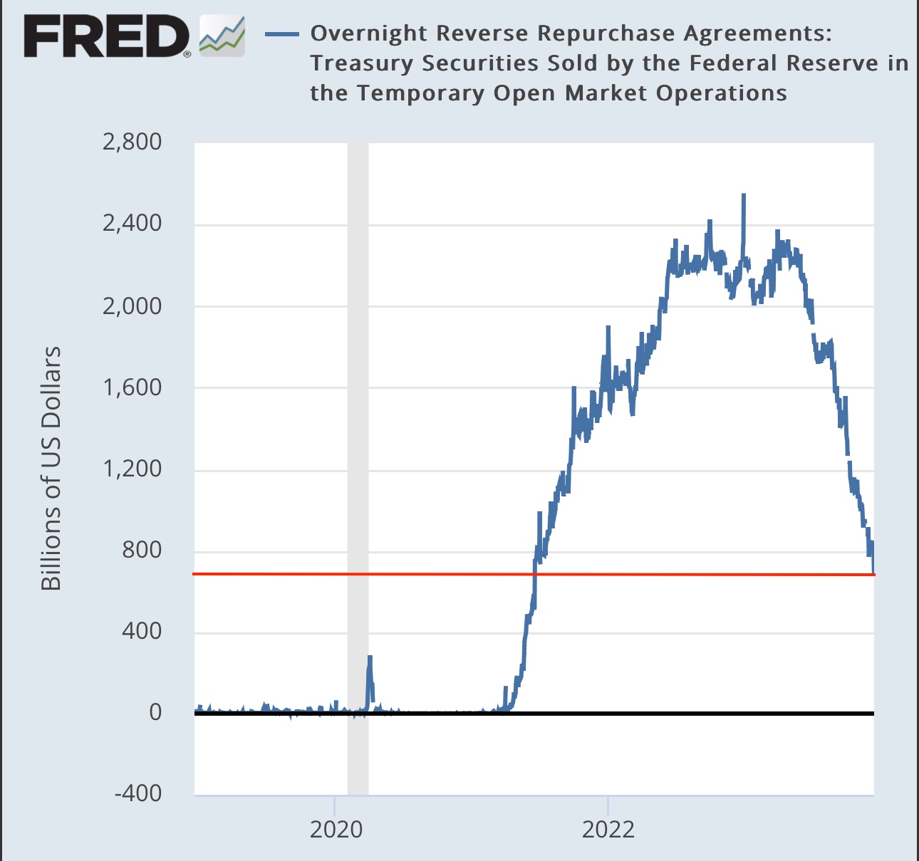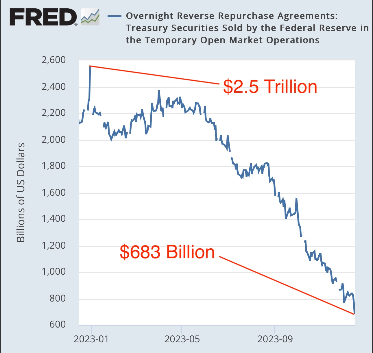 The Federal Reserve's Reverse Repo facility is rapidly depleting, currently standing at a mere $683 billion. A stark contrast to its peak of $2.5 trillion just a year ago.