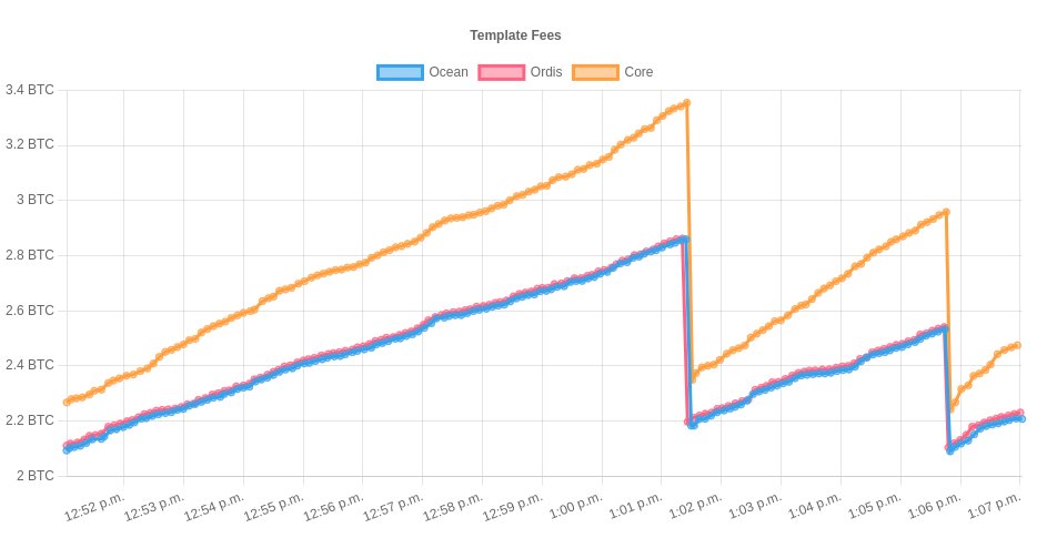 I was curious how the new OCEAN block templates compare in terms of fees. Here's a quick-and-dirty client-side tool that connects the OCEAN web sockets and plots the fees in the template: https://0xb10c.github.io/ocean-xyz-templates/