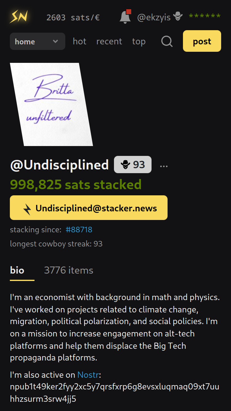 It's been interesting to observe myself -- my buy-in to SN was 10k sats, everything else was zaps I've received, which makes me feel very pro-social: my overwhelming desire is to pay it forward for the larger good, just as I received other people's generosity and was encouraged by it.