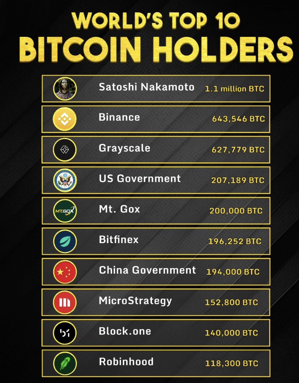The rest of the list consists of two distinct categories of BTC hodlers: crypto exchanges, financial behemoths and governments.