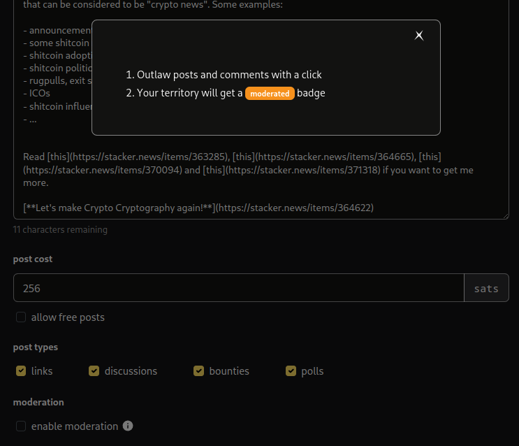 Currently, you can enable moderation to outlaw content in your territory with one click: