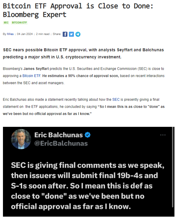 “According to sources very close to the matter, the SEC will approve Bitcoin Spot ETFs, big day tomorrow”
