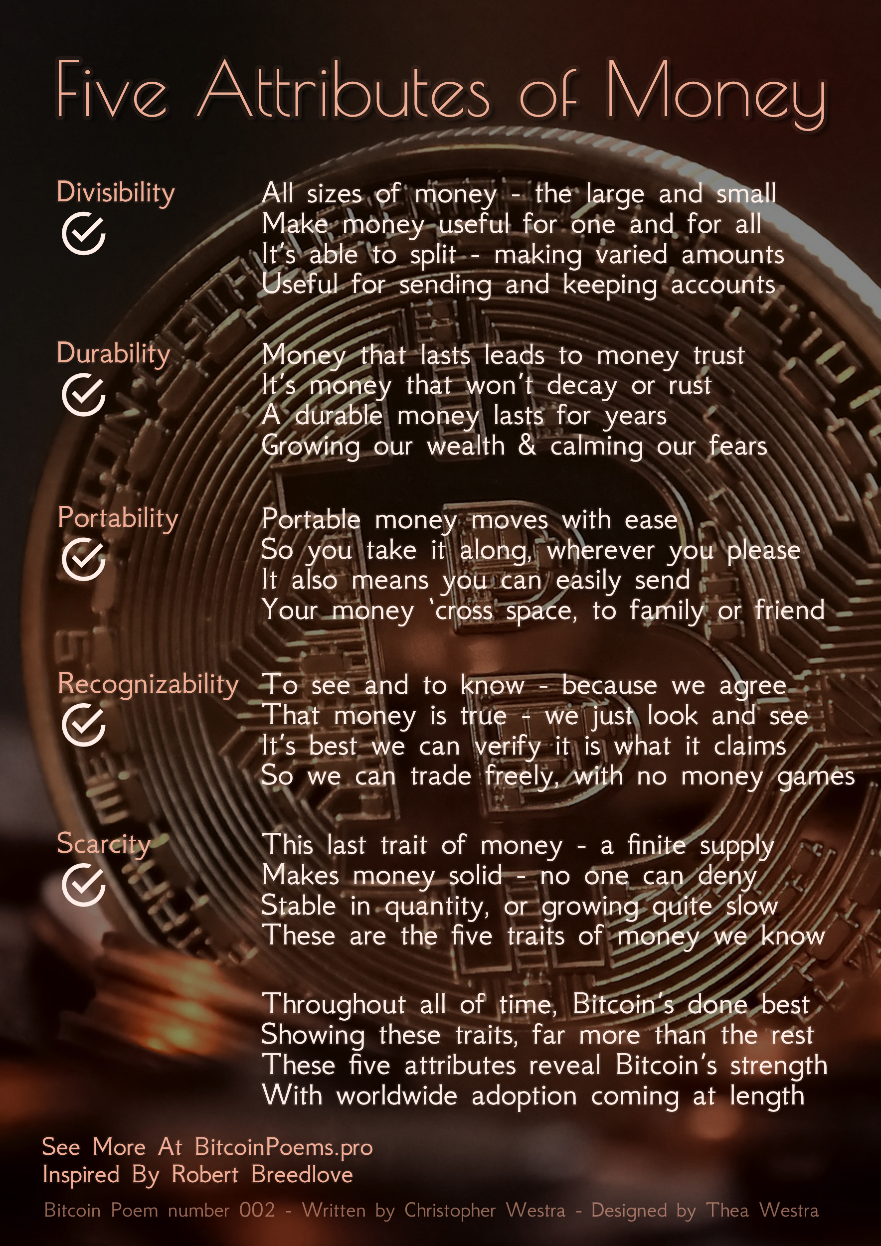 This poem was inspired by one of Robert Breedlove's videos. He presented these characteristics or attributes of money quite well, and how Bitcoin filled the requirements better than other money in the past or present. All my poems are free to use under the Creative Commons License. This is poem number 002 of 081 so far.