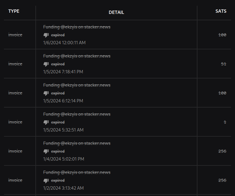 It's like a wall of all my failed attempts to zap people because my balance was too low. The one sat invoice is especially sad, lol. But now to my daily zaps of yesterday: